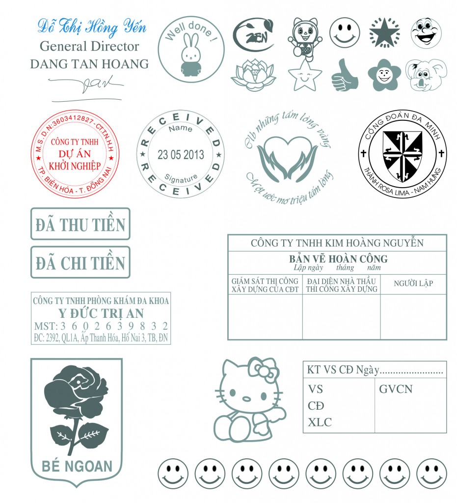 • Chủng loại con dấu công ty khắc dấu đồng nai sản xuất: Con dấu tên, con dấu mã số thuế, dấu logo, dấu chức danh, dấu đã thu tiền, đã chi tiền, bán hàng qua điện thoại, con dấu đã giao hàng, bản vẽ hoàn công, con dấu bé ngoan, con dấu cô khen, con dấu số nhảy tự động và nhiều mẫu khác theo yêu cầu của quý khách hàng.